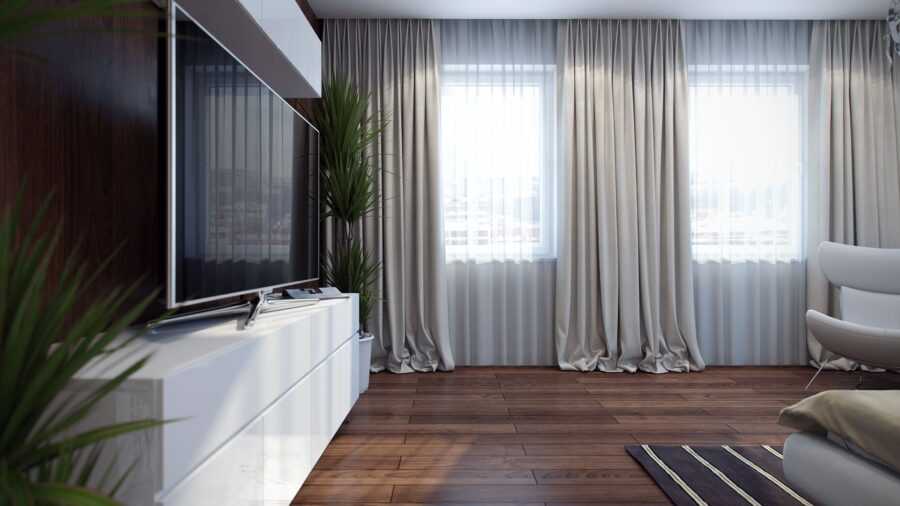 В дизайне используют сочетание тюлевых занавесок с портьерами из плотной ткани. В зоне кухни можно повесить римские модели, которые по цвету и фактуре совпадают с материалом гостиной. Привнести в оформление нотки роскоши поможет симметричный ламбрекен и подхваты в форме веревки.