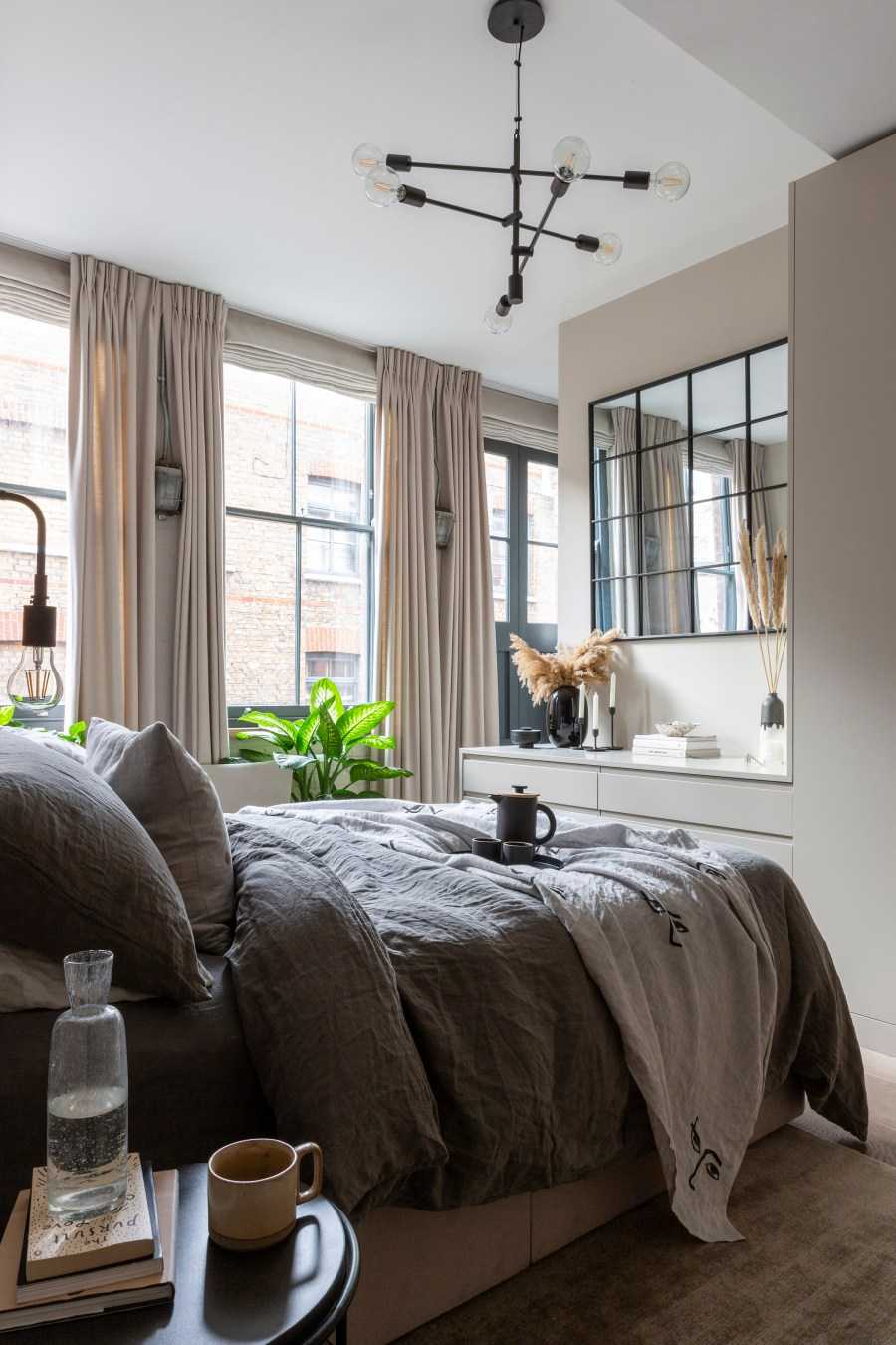 Гармоничным дополнением к бежевым шторам служит акцентная занавеска серого цвета