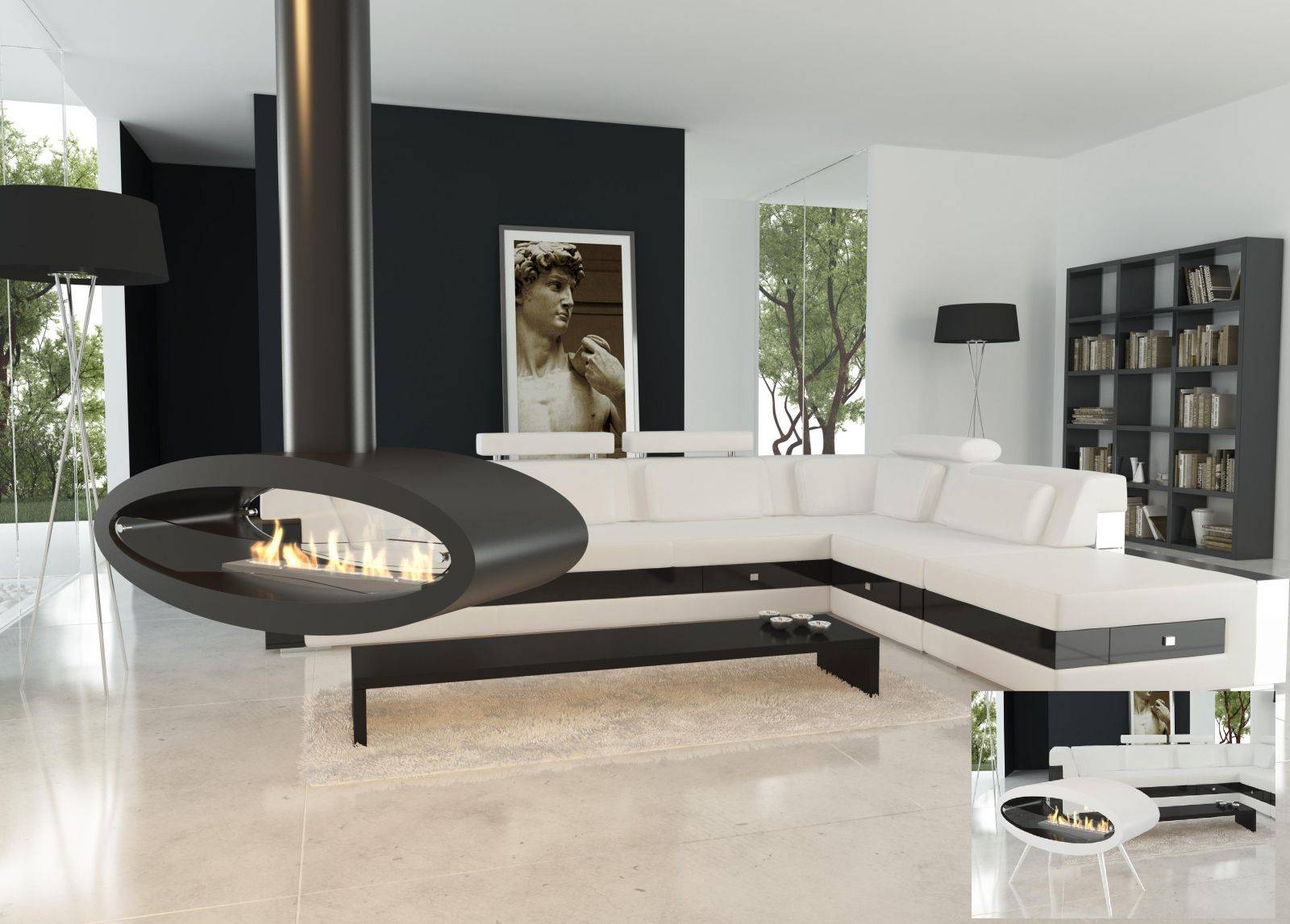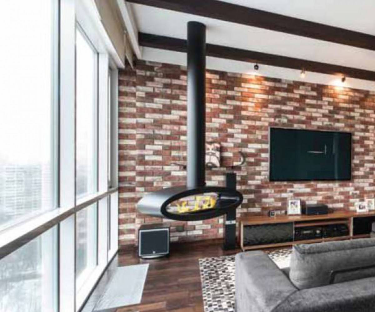 Навесной биокамин крепится к потолку и/или стене и придает особый шарм интерьеру комнаты. Фото биокамина в интерьере гостиной: