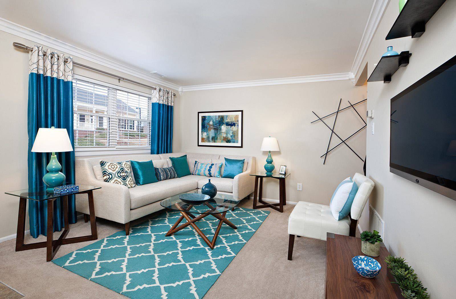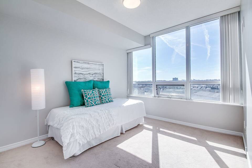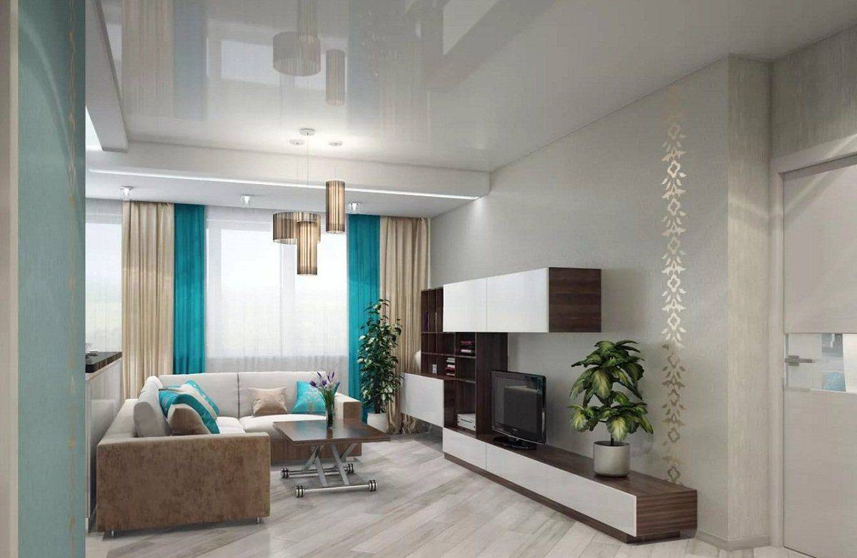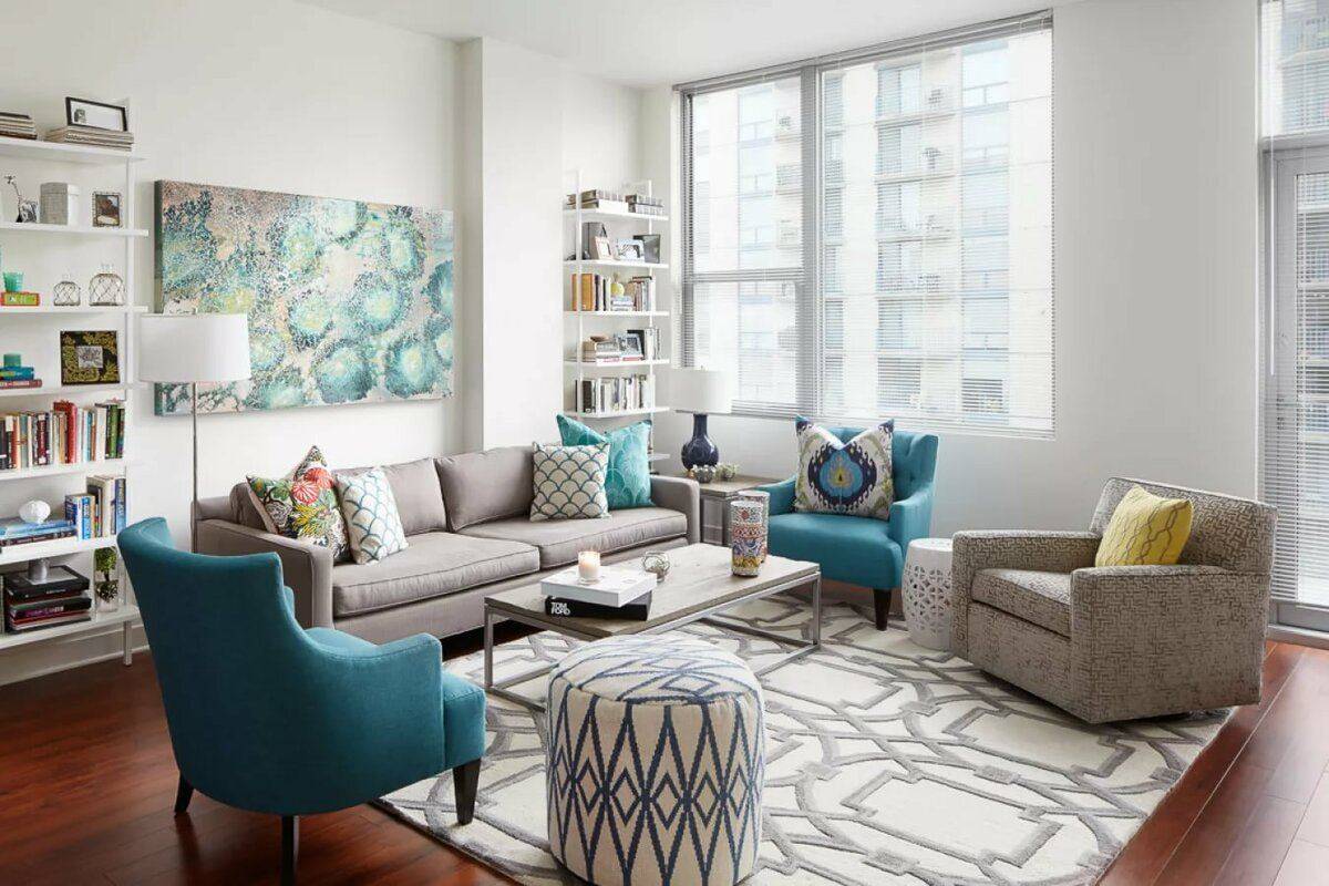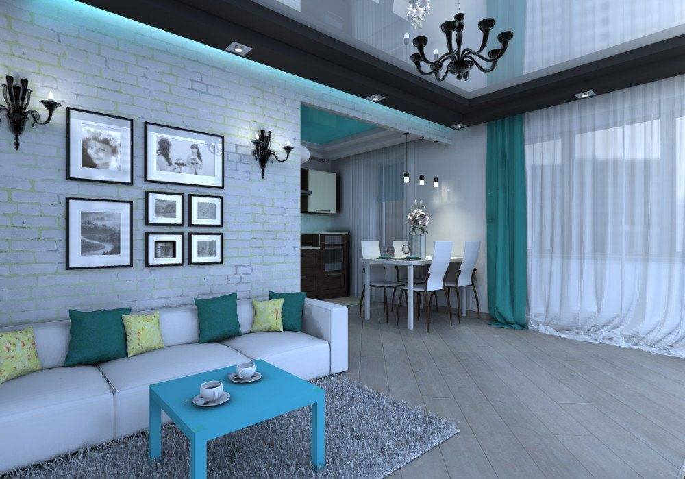 Белый с бирюзой – просторная комната с бирюзовыми подушками.