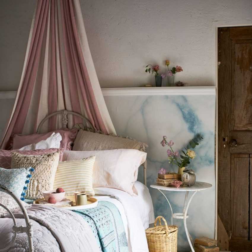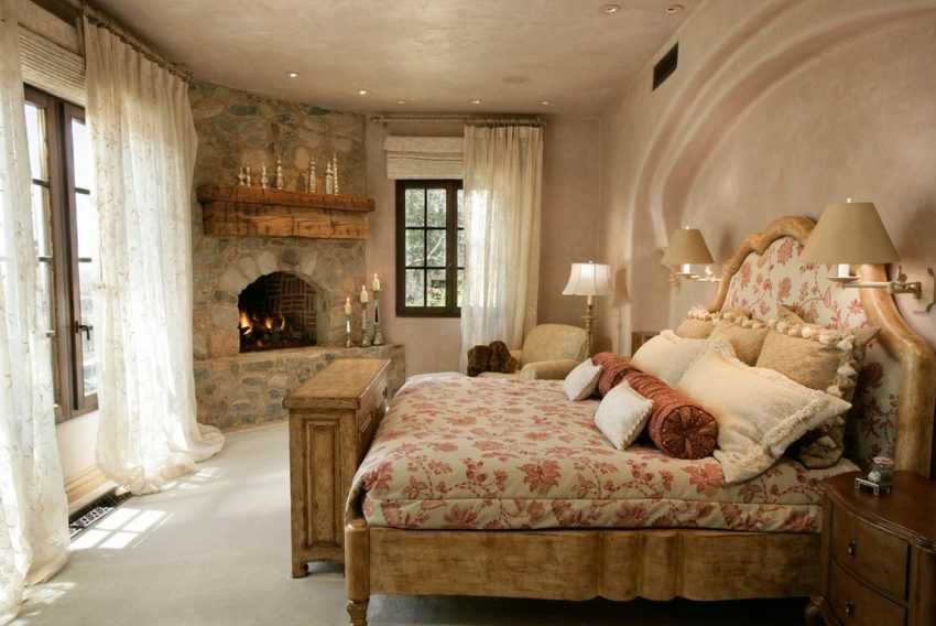 Деревенский интерьер юго-восточной Франции превращает комнату для сна в оазис нежности и уюта. Здесь преобладают простые матовые фактуры: беленый потолок, винтажная мебель из массива, ситцевые обои с мелким растительным принтом. Впрочем, стены могут быть однотонными – тогда характерные голубые узоры должны присутствовать на постельном белье, подушках, шторах. Текстиль в данном случае желательно подобрать натуральный: лен, хлопок, для окон – невесомый тюль. Для создания домашней атмосферы в провинциальной спальне не обойтись без декора: кружевных рамок, милых абажуров, картин с изображениями птиц или цветов. Бирюзовую пастель стоит дополнить белым – это может быть как «накрахмаленный» белоснежный фон, так и слегка кремовый оттенок с капелькой бежевого, желтого или розового.