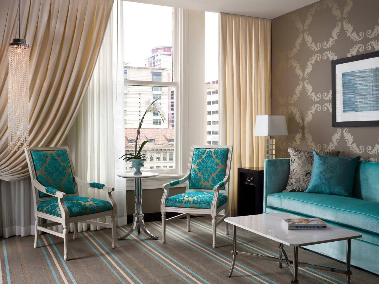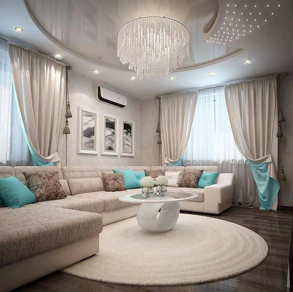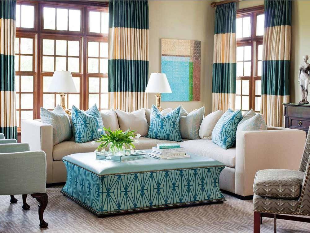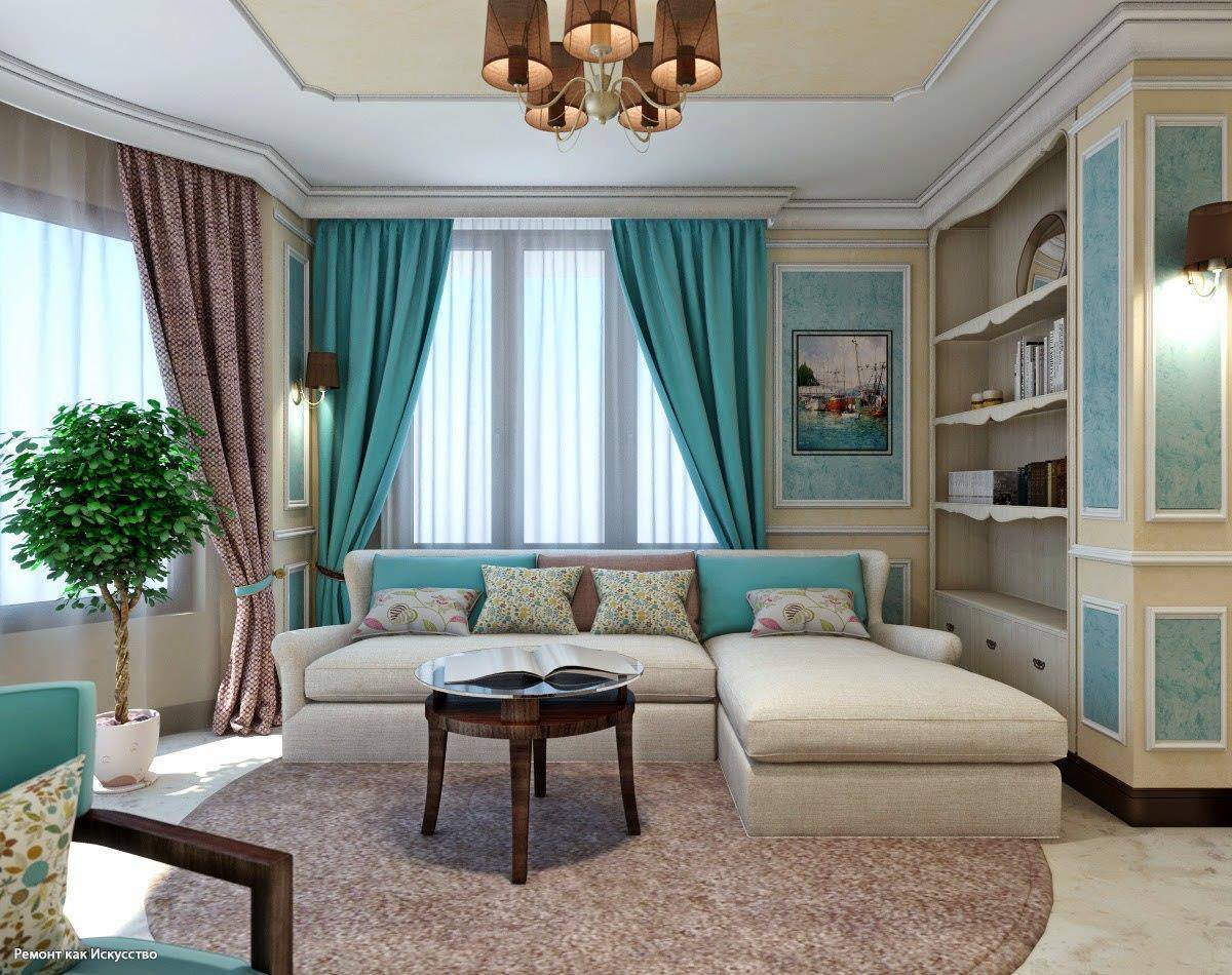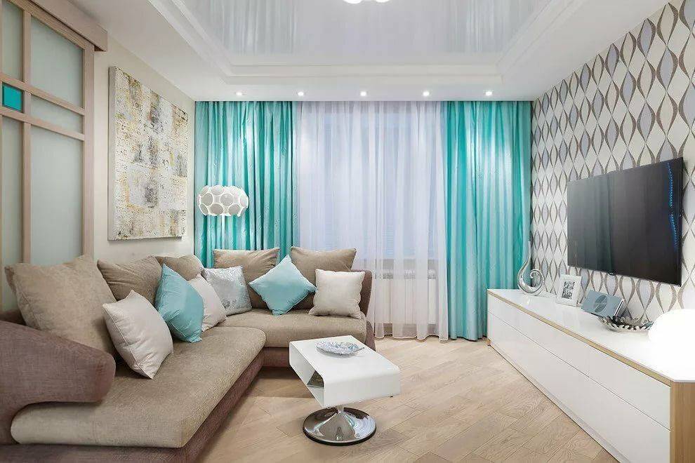 При светлых отделках можно выбрать бирюзовый текстиль, если 1 или более стен в цвете морской волны, тогда текстиль бежевых или пастельных тонов, можно и коричневую обивку для мебели.