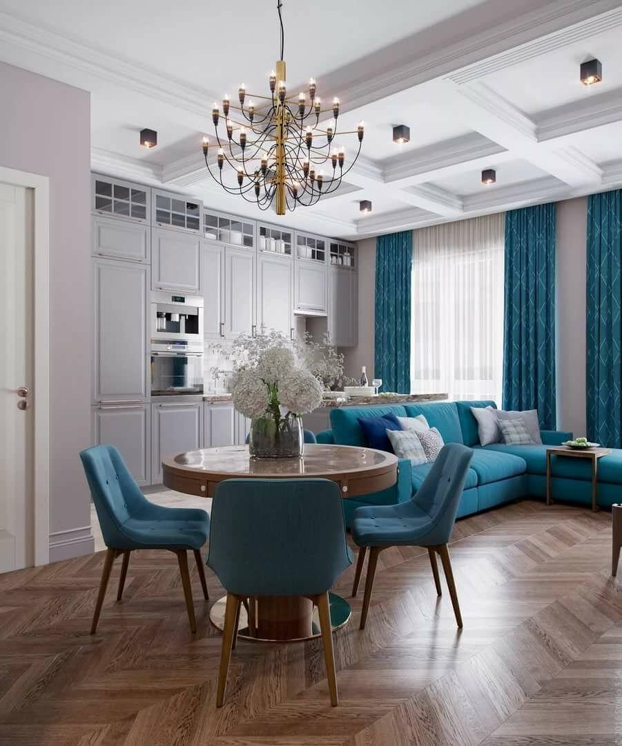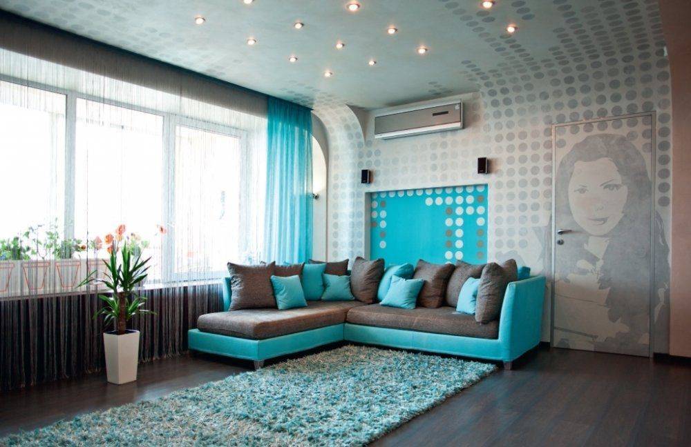 Все чаще можно видеть в продаже красивую ярко-бирюзовую мебель: кровать, диваны, кресла и стулья. Но следует продумать красивое сочетание их с отделкой.