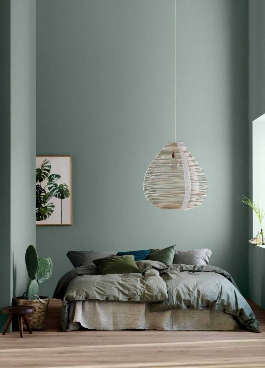 Для любителей минимализма, спальню можно оформить в светло-зеленых оттенках с яркими контрастными коричневыми цветами. Придать спальне законченный вид помогут растения и небольшие фонтанчики.
