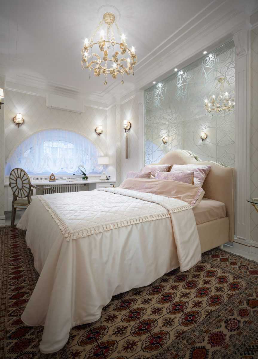 Глянцевое покрытие будет слишком перетягивать одеяло на себя, лучше остановить свой выбор на сатиновых, матовых или тканевых потолках. От белого до нежно-розового колера потолки подойдут для любых спален.