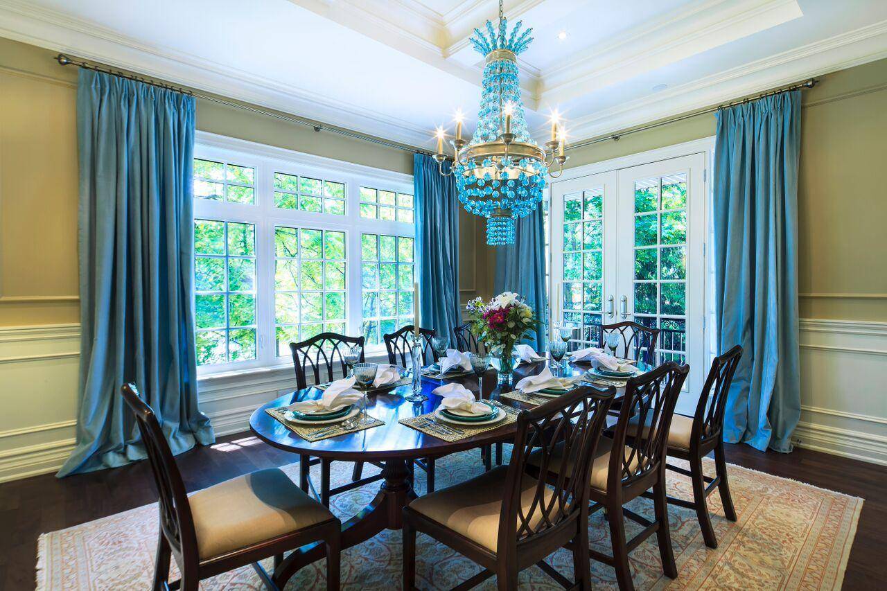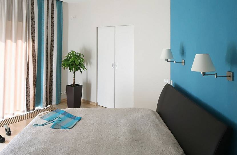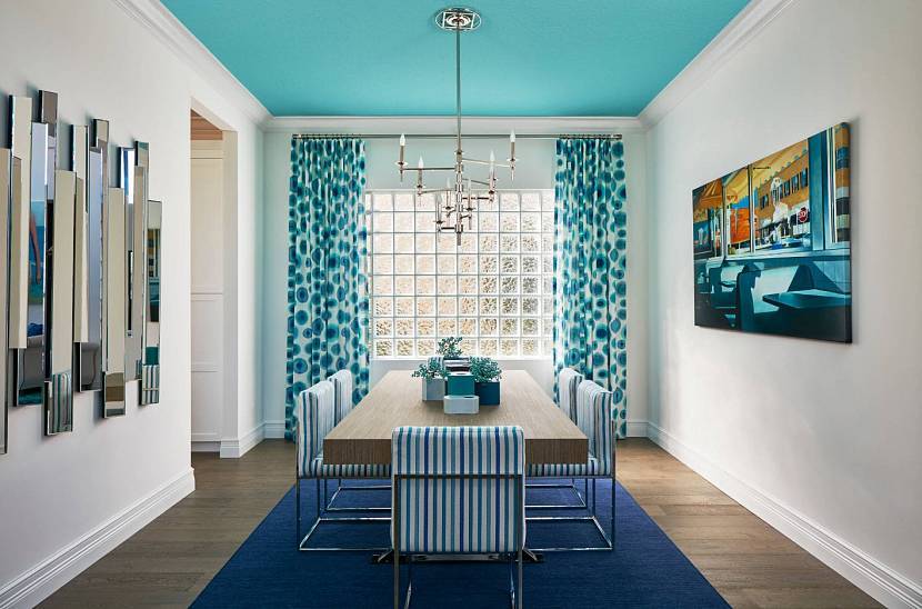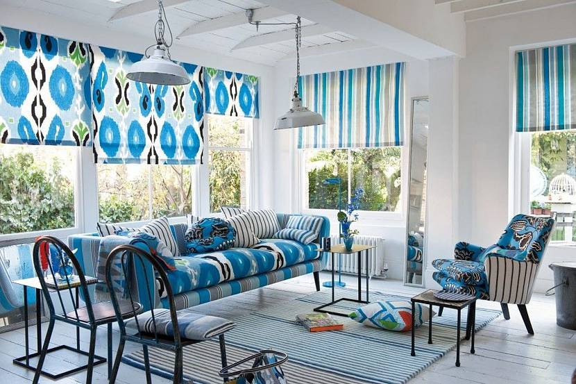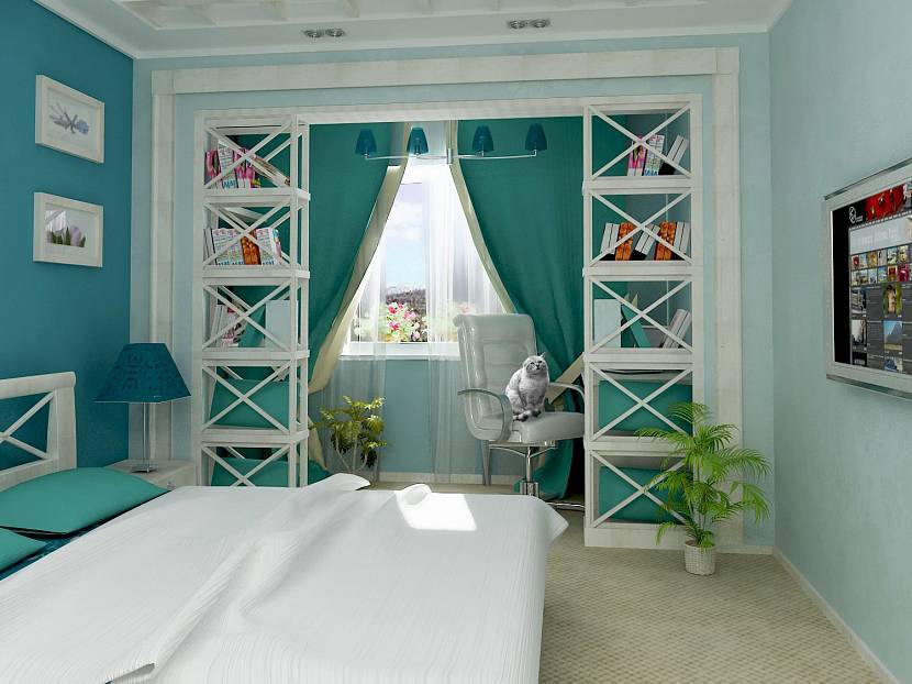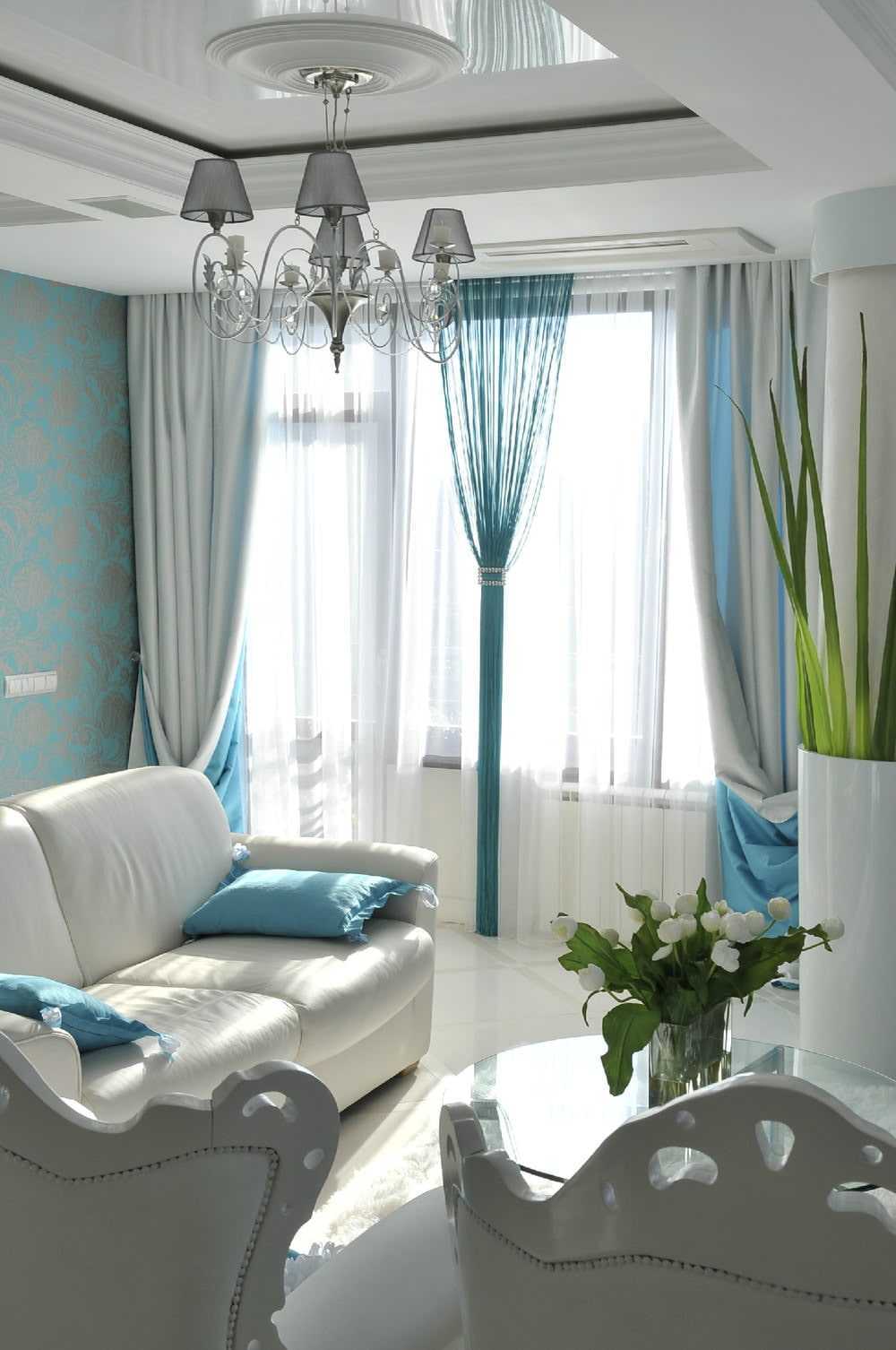 смотрятся изящно, увеличивая высоту комнаты. Голубые и бирюзовые занавеси придают ощущение свежести и прохлады.