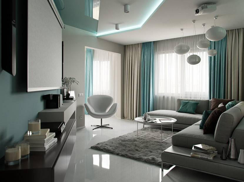 сочетание бирюзовых штор, мебели и потолка в гостинной