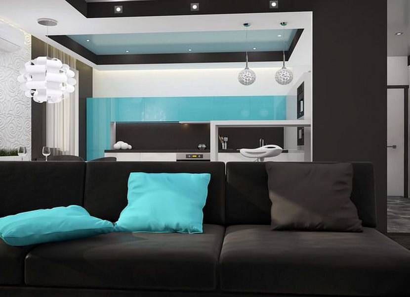 По дизайну комнаты подбирать диван в бирюзовом оттенке – это сплошное удовольствие, ведь этот оттенок находит реализацию практически в каждом направлении.