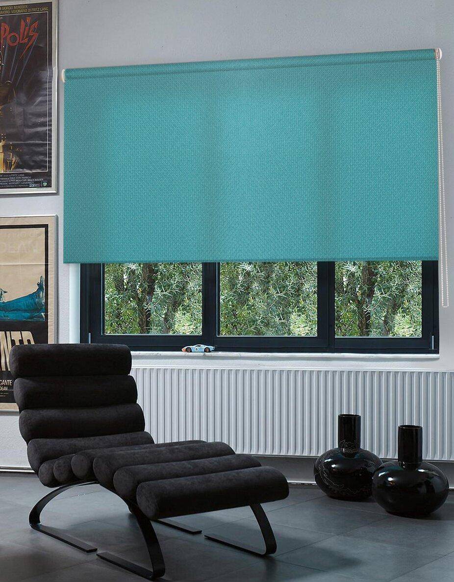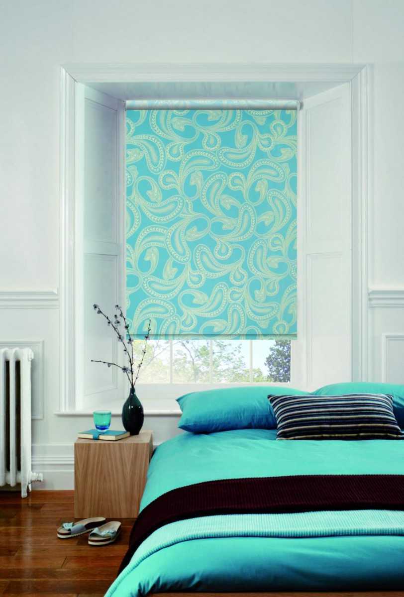 Римские шторы бирюзового цвета гармонично смотрятся в лаконичных интерьерных решениях. Основным их украшением является фактура полотна и рисунок.