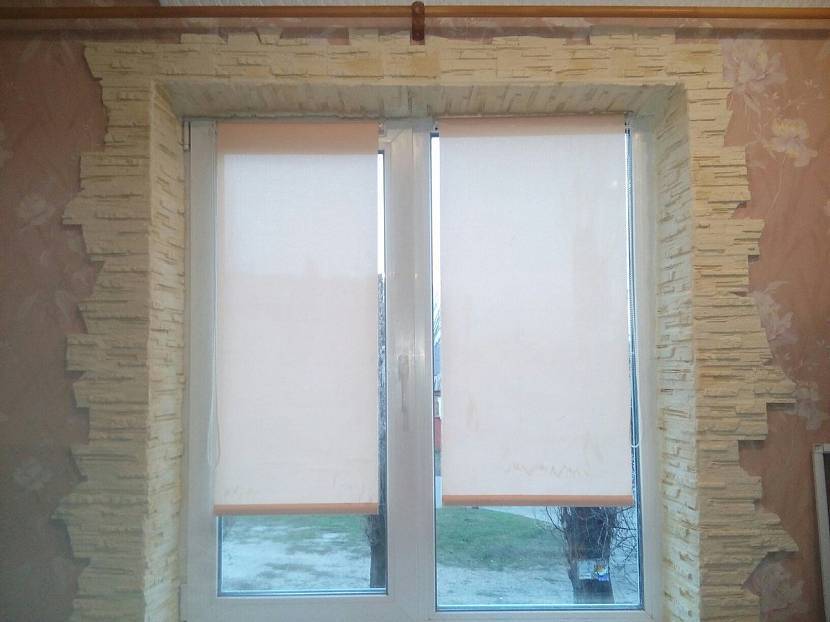 Эффектные откосы по периметру окна освежают пространство без занавесок. Самый подходящий материал для этой цели – декоративный камень или плитка.