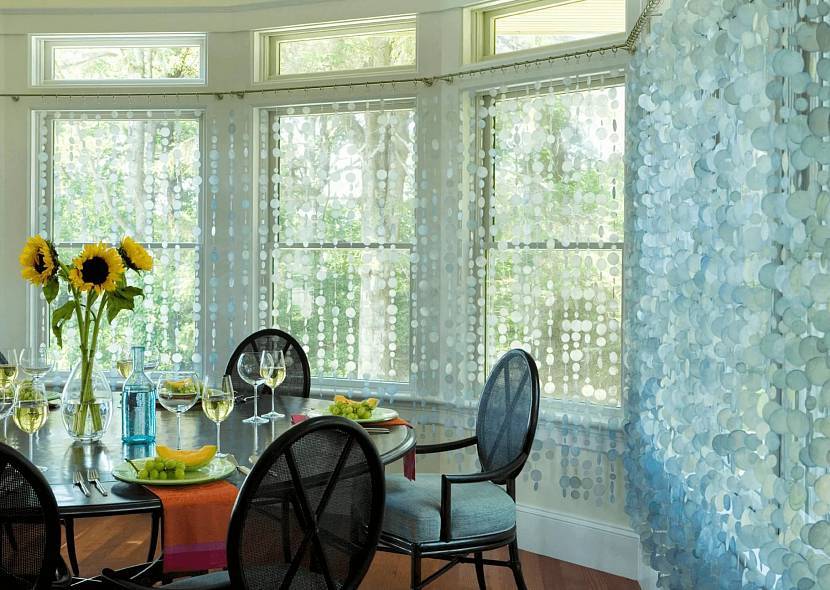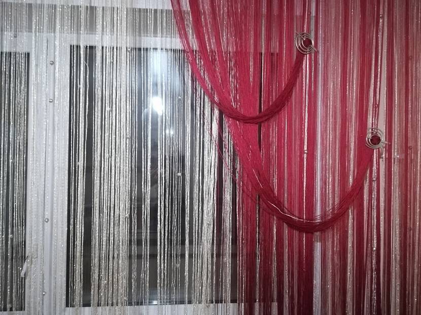 Их можно сделать самостоятельно и воплотить свои творческие идеи. Тканевые нити подразумевают собой не только прямое понятие слова, но и то, что нити могут быть даже из бисера и бусинок, деревянных шариков, бамбуковых тростей и всего, на что хватит фантазии и креатива. Занавеска из нитей может быть разной длины. Создают прекрасный тандем со стандартными занавесками.
