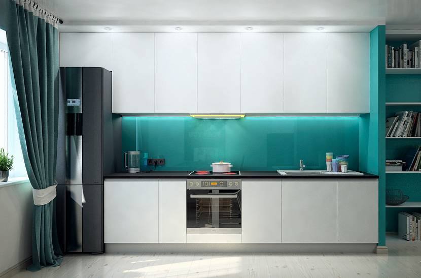 Сине-зеленая палитра гармонично вписывается в кухнюхай-тек. Аквамариновые глянцевые фасады гарнитура повторяют гамму штор, встречаются в плитке-шахматке на полу и в облицовке фартука. Как и для спальни в бирюзовых тонах, на окнах можно использовать гардины-нитки.