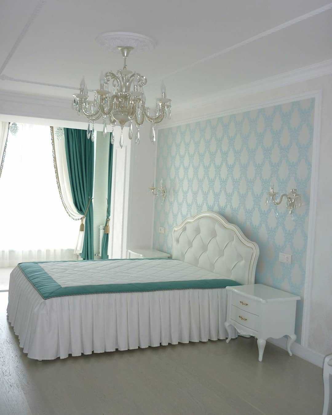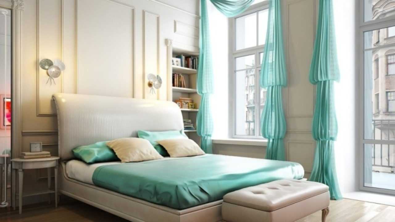 Бирюзовая спальня с нитяными занавесками на окнах удачнее выглядит в комбинации с белым (бежевым) на стенах. В светлой комнате с драпировками и текстилем на постели цвета морской волны визуально создается эффект бесконечного пространства. Разбавить холодность интерьера поможет аксессуар яркого оттенка.
