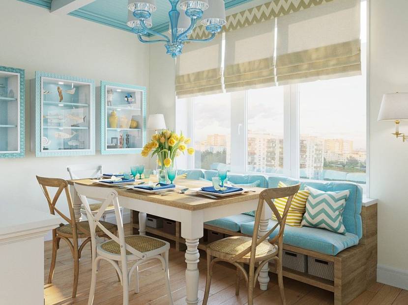 Размеры маленькой комнаты можно скорректировать при помощи белой отделки и пола из светлой древесины. Сине-зеленый цвет берут для портьер с ламбрекенами и для обивки диванов, кресел. В зале и на кухне красиво смотрится мебель из ротанга, дополненная подушками с бирюзовыми наволочками.