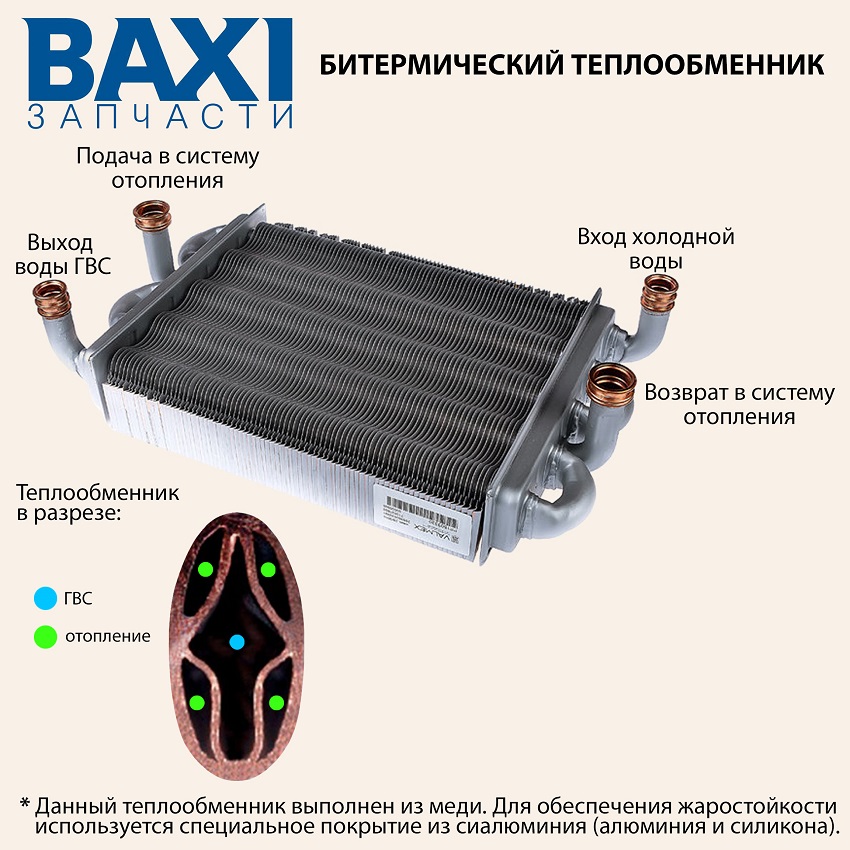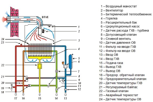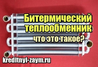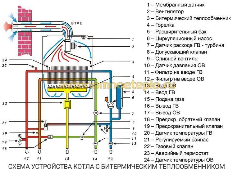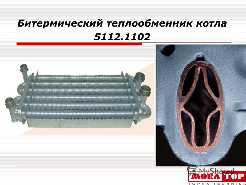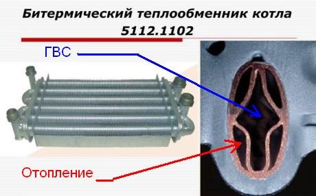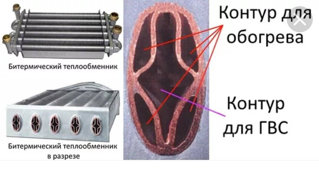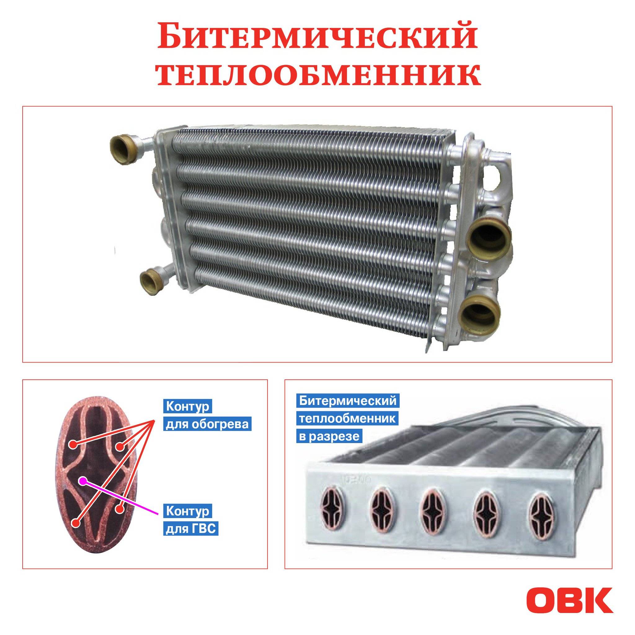 В битермическом или совмещенном теплообменнике объединены две системы обмена тепла — от газа к тепловому носителю и от теплоносителя к воде, необходимой для горячего водоснабжения. Устройство представляет вставленные друг в друга полые трубы, по которым циркулирует вода.Для обслуживания используют специальные бустеры для промывки.