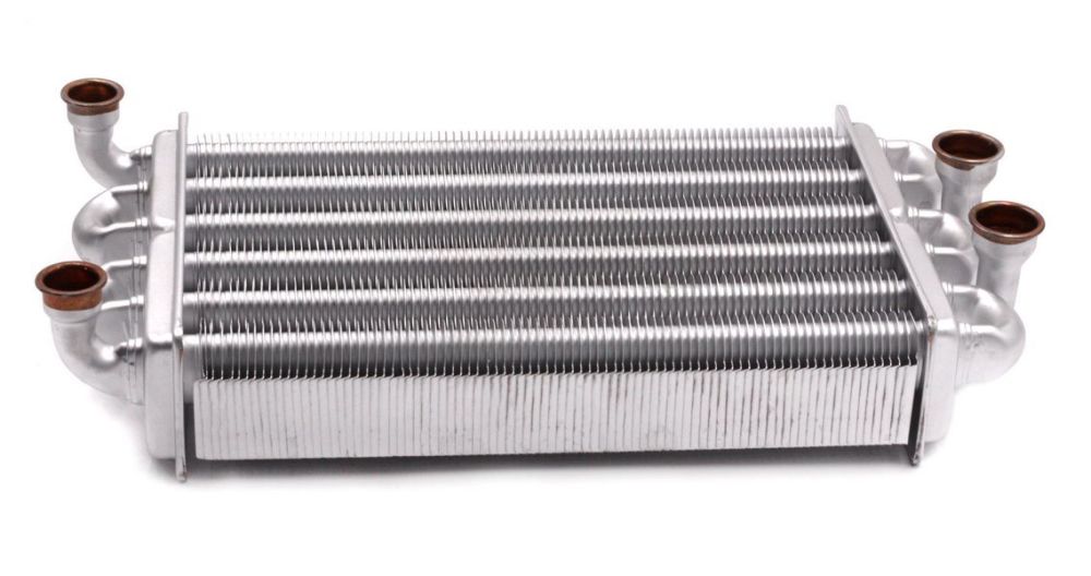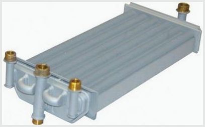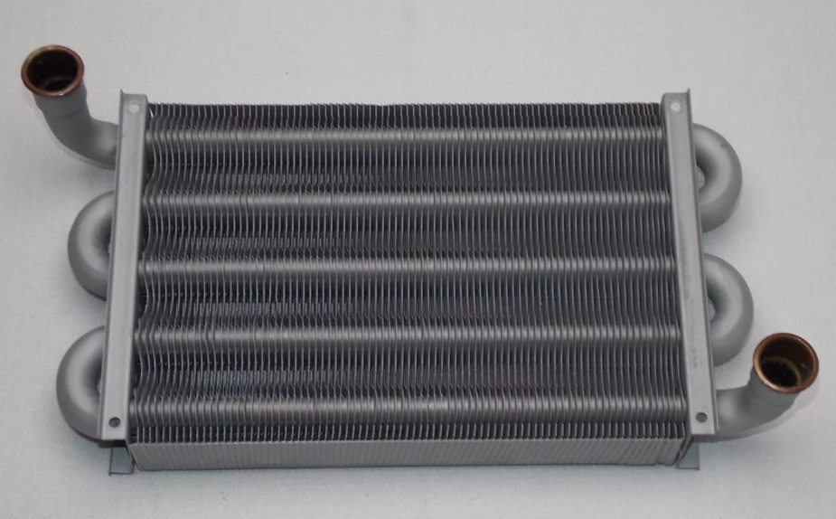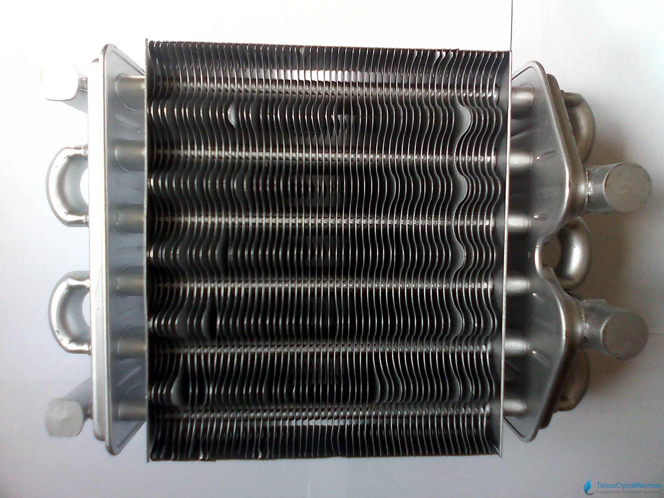 При участии первичного, состоящего из медных трубок и пластин, осуществляется передача тепла от сгорающего в горелке газа к жидкому теплоносителю. Используется в основном в контуре отопления помещений.