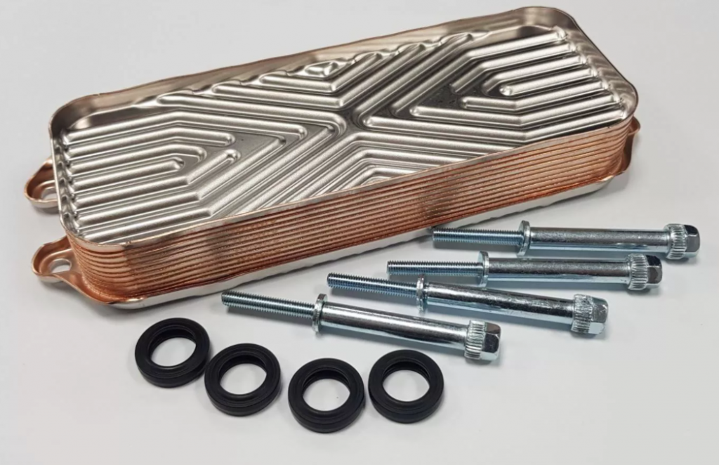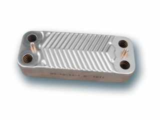 Вторичный обменник передает тепло от нагретого (в первичном термобменнике) носителя непосредственно к нагреваемой среде. Представляет собой пластинчатое устройство, предназначенное для подогрева воды из водопроводной системы дома.