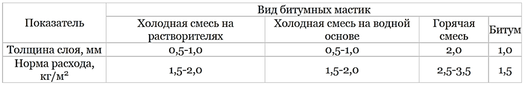 Расходование битумной мастики по поверхности определяется толщиной наносимого слоя. Существуют следующие правила её расхода для различных случаев применения: