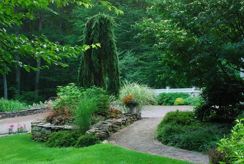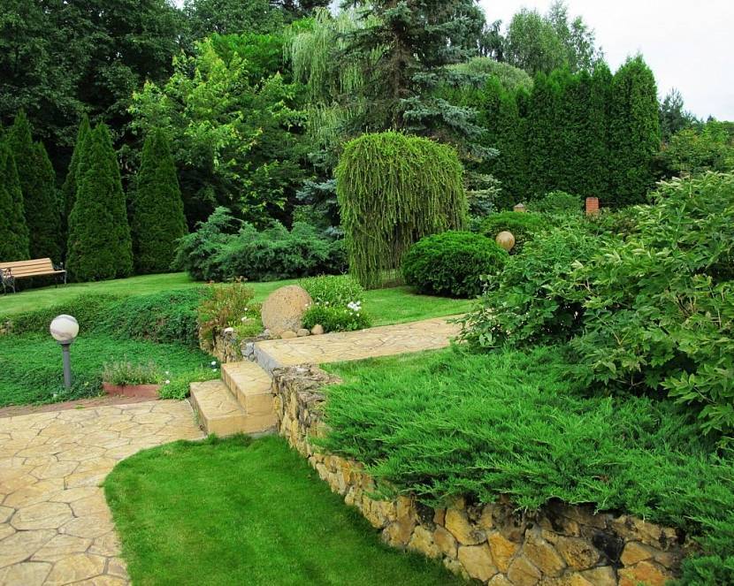 Обладателем северных склонов повезло больше. Здесь можно создать хвойный сад. В него будут включены деревья, кустарники и некоторые мелкие приземистые растения. Красивые туйки в форме треугольника на заднем плане отлично вписываются в общую обстановку дворовой территории.