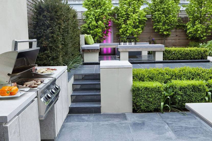 Гостеприимным хозяевам понадобится зона для приготовления пищи: место под беседку с мангалом, систему барбекю, печь под навесом. Для завершения композиции желательно оборудовать рядом газоны, цветники или создать альпийскую горку.