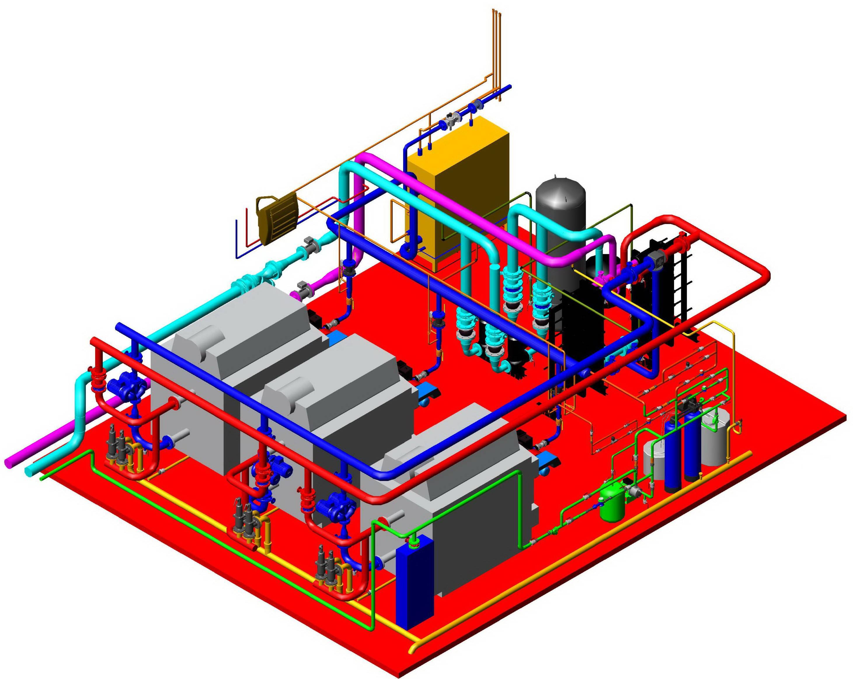 - основное оборудование (котлы водогрейной, паровой, смешанной разновидности — их число и характеристики определяются поставленными целями);