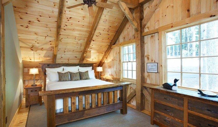 Чтобы сон был крепким и спокойным, аромат дерева – самое то! Поэтому в спальне как нигде уместна отделка имитацией бруса. Существует огромное количество дизайнерских решений по отделке спален. Если мебель имеет определенный оттенок дерева, можно подобрать тот же или контрастный тон для отделки стен. Необязательно отделывать комнату брусом от пола до потолка – этот пиломатериал прекрасно комбинируется с другими отделочными материалами.