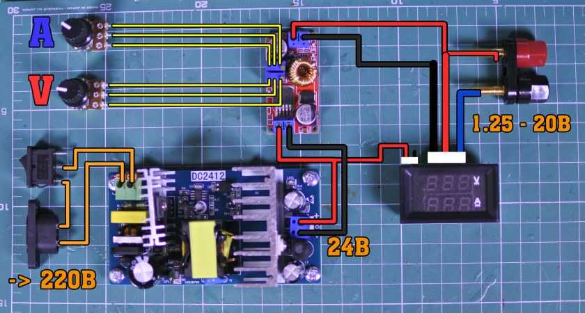 После этого необходимо распаять резисторы, подключить к ним выключатель прибора. Распаять провода ампервольтметра. После того, как основные элементы были подсоединены, необходимо вернуть все элементы из передней части панели устройства на свое первоначальное место. Таким образом, собрав все элементы в единое устройство, получаем возможность регулировки напряжения начиная от 1 в, заканчивая 28 в.