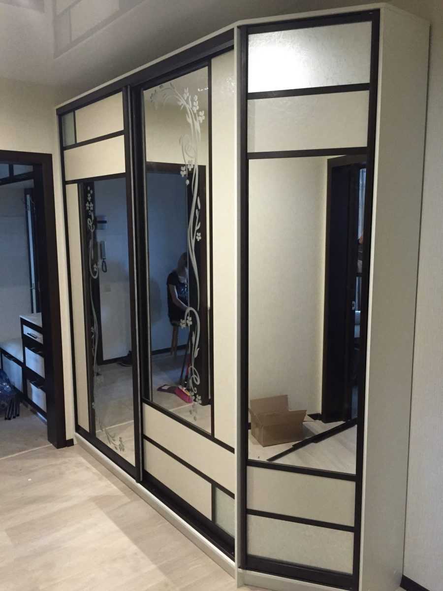 Настоящим модным трендом стала установка мебели с зеркальными дверными полотнами. Неоспоримые плюсы модели – пространство визуально становится больше, повышается функциональность (жильцам удобно оценить свой внешний вид перед выходом). Можно придать мебели индивидуальные черты за счет разнообразной отделки стеклянной поверхности: узоры, гравировка, рисунок.