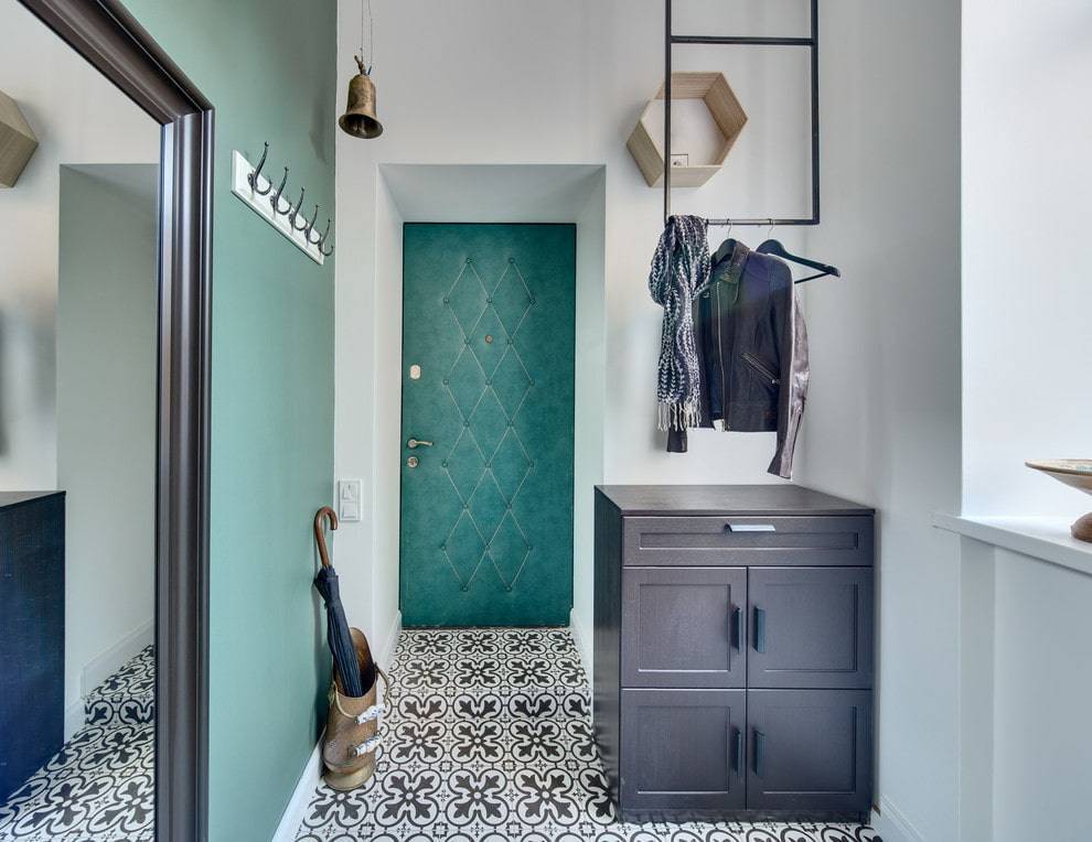 На фото подвесной комод, комбинированный с вешалкой в дизайне малогабаритной прихожей.