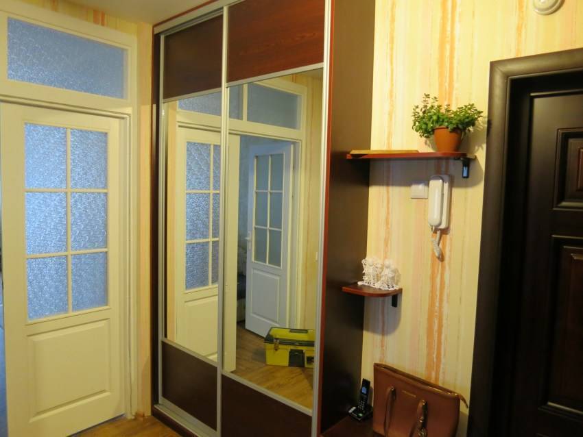 Если площадь прихожей позволяет, один из ее углов отводят под устройство квадратного в плане шкафа с раздвижными дверцами. Размер такой конструкции позволяет назвать ее отдельным помещением и использовать в качестве полноценной гардеробной.