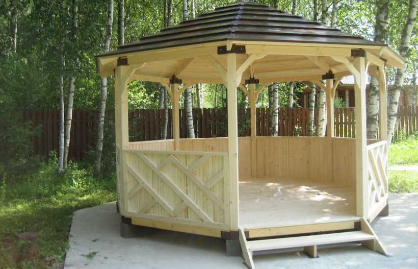 Сосновые доски легко обрабатываются, изделие, изготовленное из сосны прочны, служат долго, экологически чисты. Форма столешницы может быть прямоугольной, круглой или многогранной повторяя форму беседки.