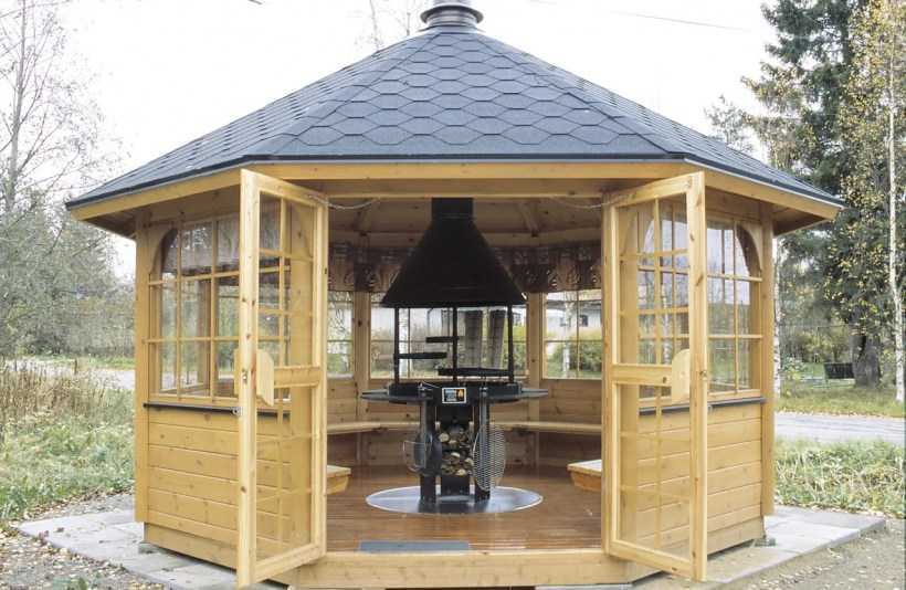 - финская беседка под барбекю, или гриль-домик, — шестигранный застекленный дом с двустворчатой застекленной дверью, по периметру оборудована лавка, а в центре расположен гриль с выведенной на крышу трубой;