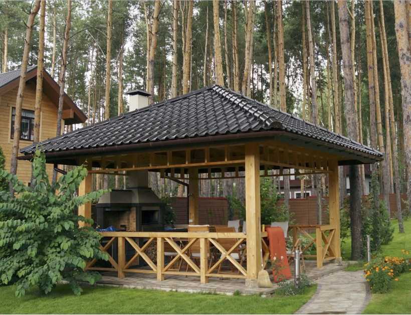 - беседка в русском стиле — украшена резными деревянными элементами;