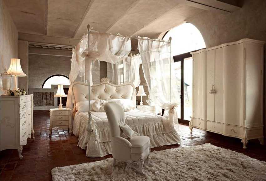 В таком направлении приветствуется симметричность линий, изящные дополнения, возможно лепнина. Спальный гарнитур строго белого или кремового цвета с глянцевой фактурой. Такие детали отражают окружающую обстановку, помещение приобретает свежесть и легкость.
