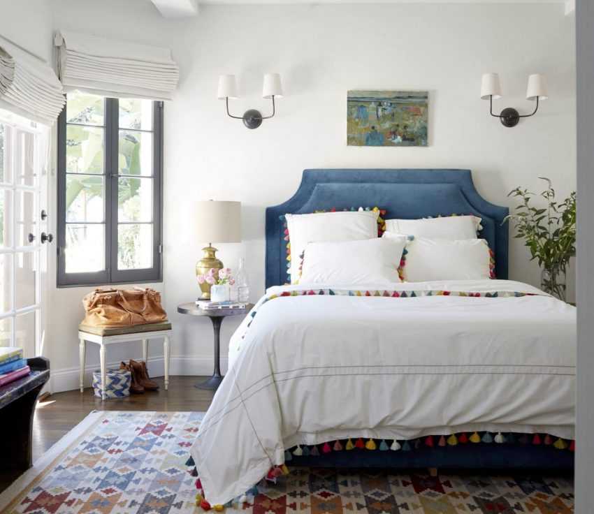 В таком стиле интерьера предпочтительнее использовать светлые тона и акцентировать внимание на спальном месте. Для этого используют декорирование подушками, накидками и покрывалами