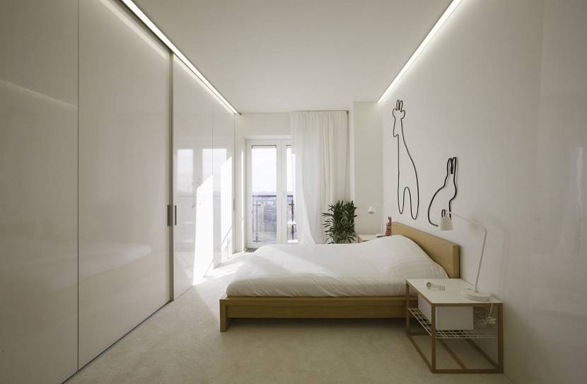 Небольшая спальня в стиле минимализм подразумевает размещение функциональной мебели. Допускается совмещение зеркал, выезжающих створок и шкафчиков. Рекомендуют в дизайн узкой спальни встраивать полки, тумбочки и ящики. Все эти детали должны быть выдержаны в едином оттенке. Фурнитура каждого из предметов должна соответствовать интерьерному решению: никаких вычурных деталей, фигурных ручек.