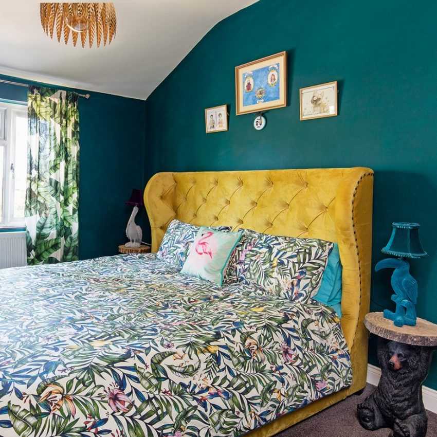 Спальня в ярких тонах частенько задействует беспроигрышный вариант, отдавая броский цвет или необычную роспись единственной стенке. Белое плетёное изголовье постели великолепно контрастирует с чёрной поверхностью, а с помощью разноцветных подушек и декора помещение «расцветает».