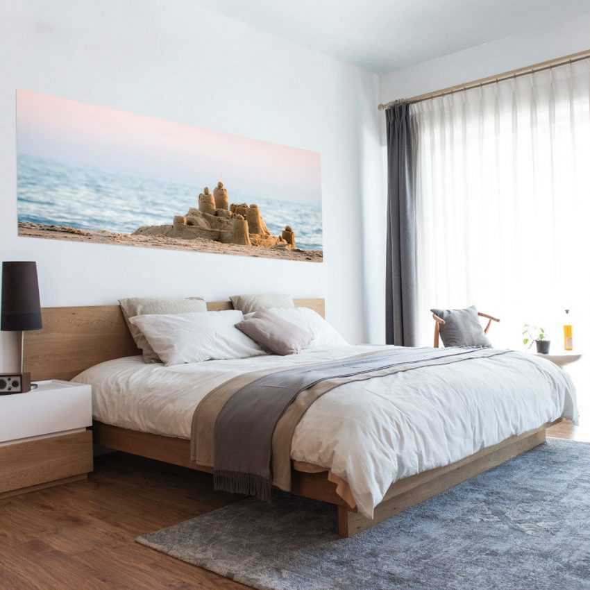 Ярким и динамичным принтам не место на стене, противоположной изголовью кровати – здесь нужны спокойные цвета, которые позволяет спокойно расслабиться. Подойдут пейзажи, изображения животных, различные абстрактные рисунки пастельных тонов.
