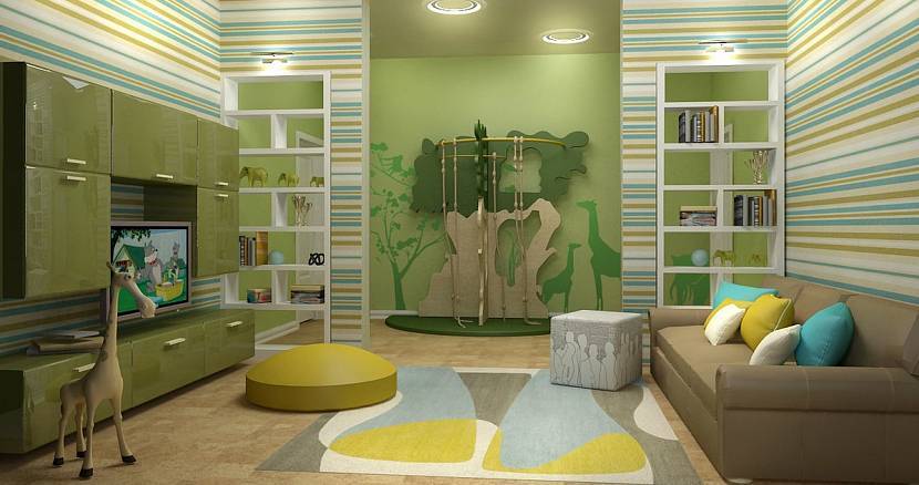 - Выигрышно смотрятся зеленые детские в сочетании с монохромными оттенками или соседними в палитре тонами.