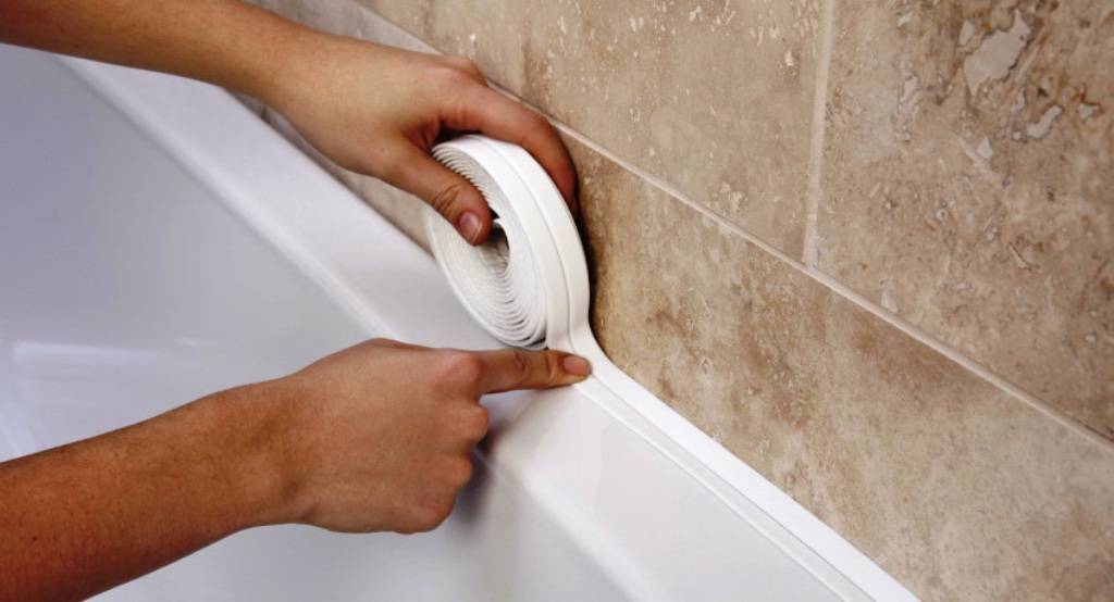 Приклеивать такую ленту нужно на стыке между ванной и стеной, так чтобы полностью закрыть образовавшуюся там щель. А для того чтобы такой бордюр прослужил как можно дольше, для его укрепления используют специальный силиконовый герметик.