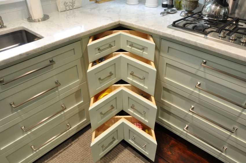 Это могут быть металлические угловые конструкции (на них размещают сковородки и объемные кастрюли), системы типа «карусель» (на ней хранят малогабаритную кухонную утварь), выдвижные контейнеры, сушки для посуды, разделители, разграничивающие объем ящика на ячейки. Сложные системы хранения помогают добиться хранения продуктов и кухонной утвари в идеальном порядке, обеспечивая простой и быстрый доступ к ним. Но при этом стоимость «начинки» может достигать стоимости самого шкафа.