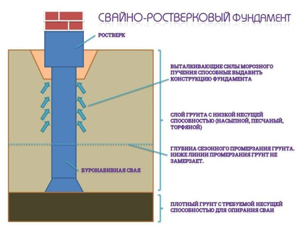 Глубину погружения сваи определяют по уровню расположения несущего грунтового слоя. Заливка бетона должна проводиться на уровень, расположенный ниже точки промерзания почвы, даже если несущий пласт располагается значительно выше.