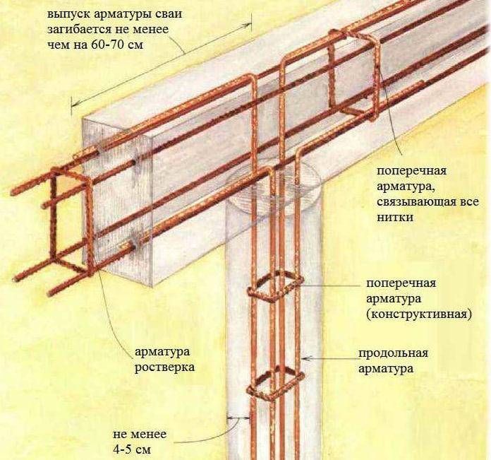 Когда создается фундамент, буронабивные сваи с ростверком обязательно должен объединять армированный каркас. Армируют рифлеными стальными прутами диаметром 10-12 миллиметров, вяжут гладкой вязальной проволокой сечением от 6 миллиметров.