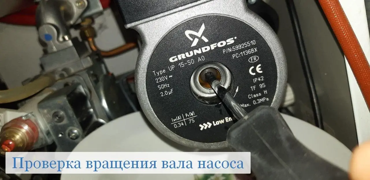 Проверить, вращается ли вал насоса можно либо с помощью магнитного индикатора, либо открутив пробку насоса, отверткой прикоснуться к валу насоса – будет понятно, вращается он или нет (для этого на валу предусмотрены шлицы). Вал хорошо работающего насоса нажатием заблокировать очень трудно (так их проверяют сервисные специалисты). Таким же образом, с помощью отвертки, можно проверить вращение вала насоса на неработающем котле. Вал должен крутиться без затруднений.