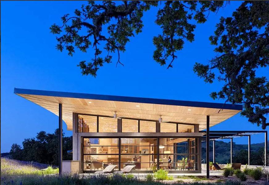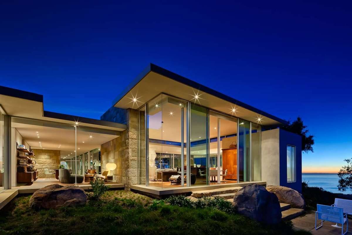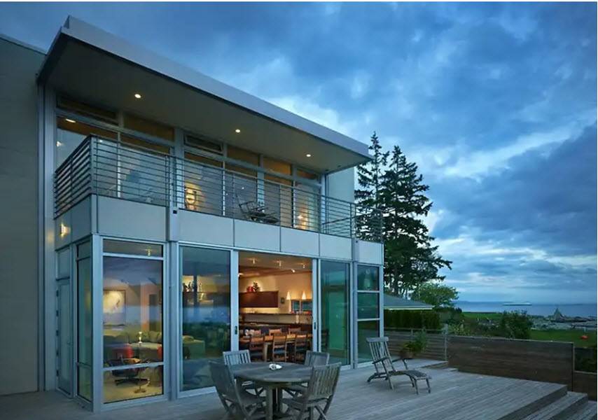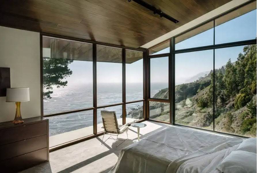 Рассмотрим отличный пример дома из стекла и стали, который расположен на вершине холма, с южной стороны дома открывается вид на бескрайнее море, с северной стороны виден чудесный лес. Комфортный интерьер поддерживает баланс между современным и деревенским.