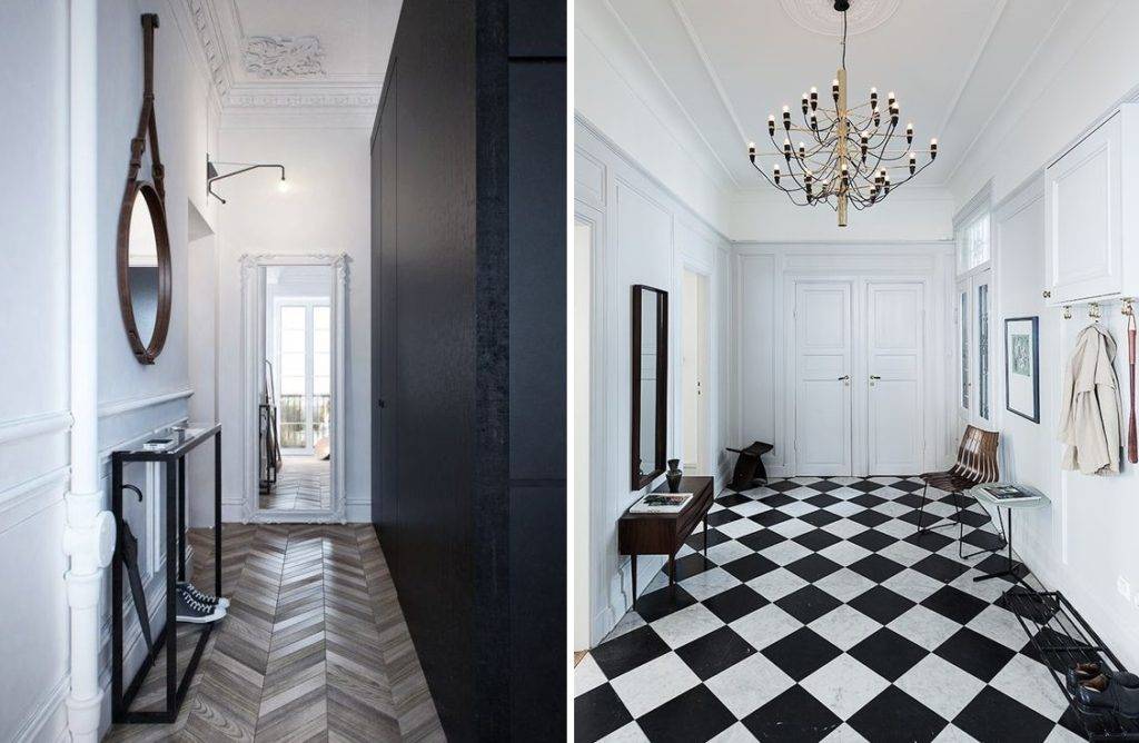 Входная зона должна быть легко очищаемой, поэтому выбирайте удобное напольное покрытие. Гладкая поверхность позволит вам быстро удалить грязь. Также хорошо подойдет шахматный рисунок, который в сочетании с лепниной на стенах будет выглядеть эффектно.