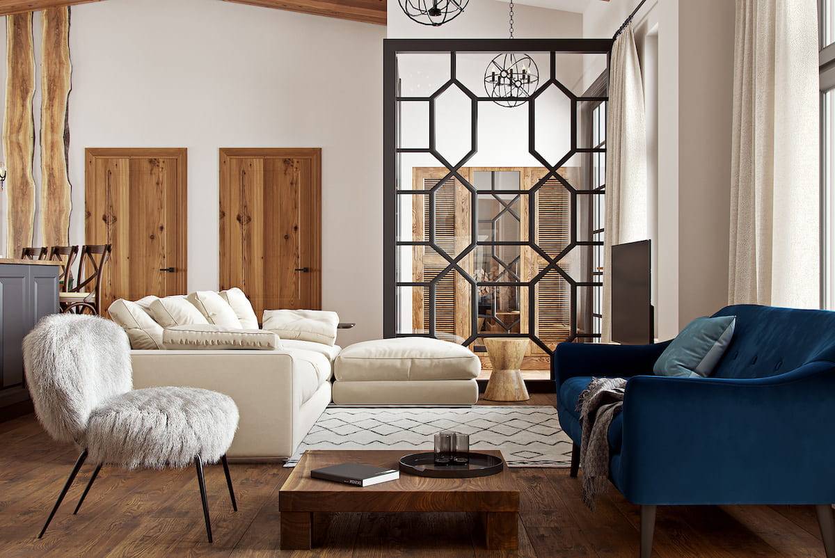 В гостиной современный диван может соседствовать с уютным креслом-качалкой, плетеные предметы интерьера могут гармонично вписаться рядом с металлическими стеллажами.