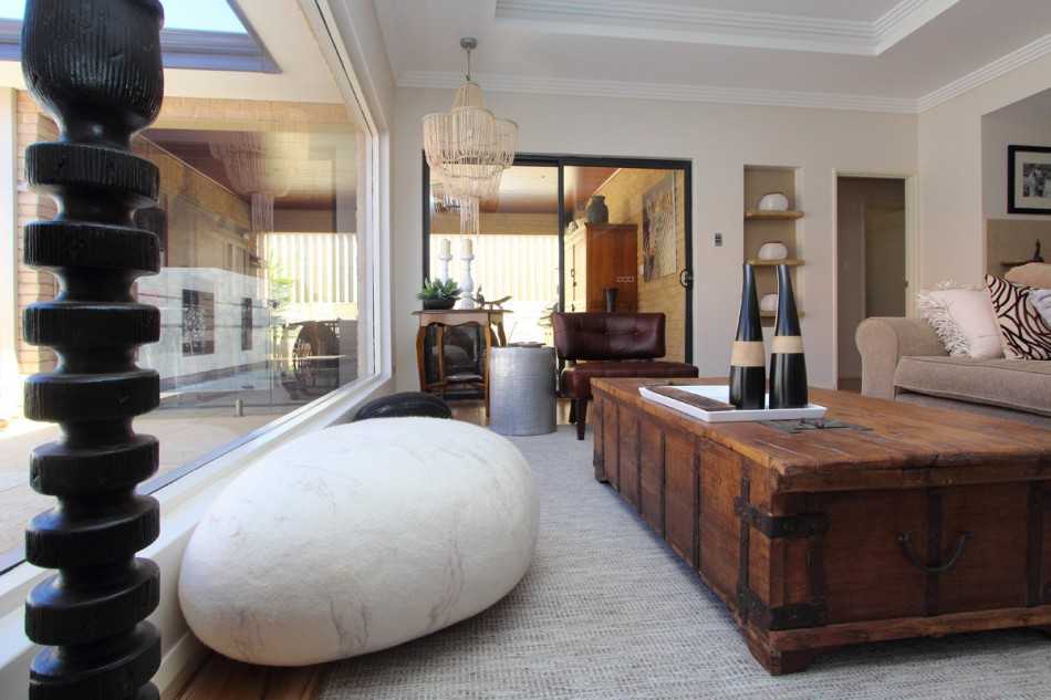 Ценность представляют статуэтки, разнообразные предметы ручной работы, включая мебель, необычный привлекающий внимание текстиль. Ярким акцентом послужит резной сундук, бронзовая лампа, напольный ковер с этническими оригинальными узорами