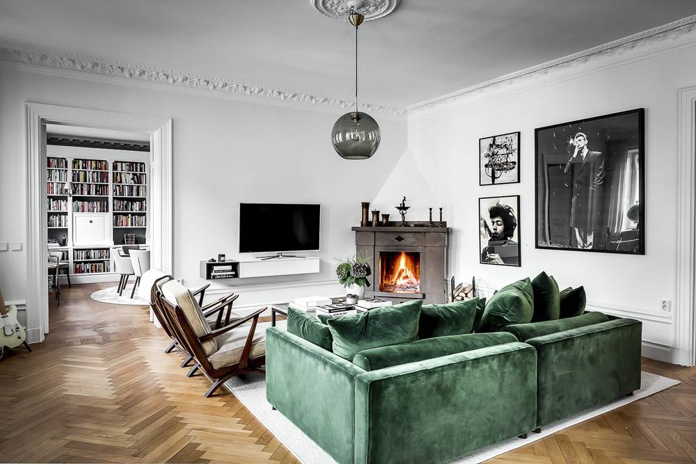 Исторические мотивы. Глубокие по насыщению изумрудно-зеленые, сапфировые, винные тона на текстиле, будто сошедшие со старинной гравюры изящно вплетаются в классический декор с позолотой, лепниной, сдержанной цветовой гаммой на стенах, паркетными благородными полами.