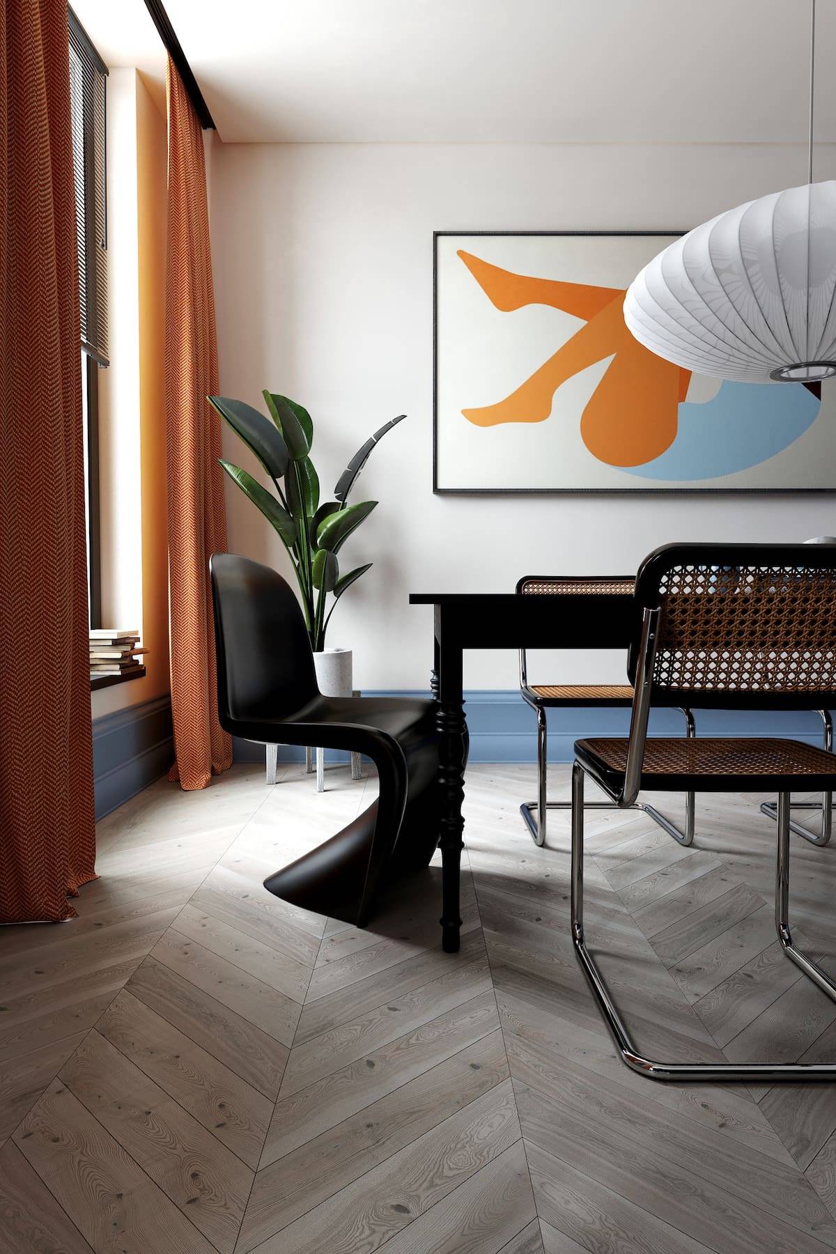Такой же эффект можно получить, настелив на пол линолеум с косым рисунком или имитирующим дерево.